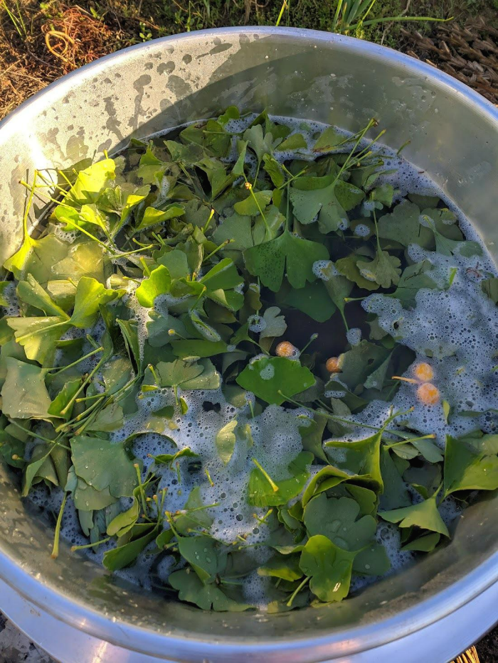 은행과 은행잎을 넣은 이 물을 오랫동안 달인다고 생각할 정도로 끓이게 되면, 은행을 이용한 천연 배추벌레 퇴치제가 만들어지게 되는 것입니다. 사람 퇴치제 역할도 합니다.
